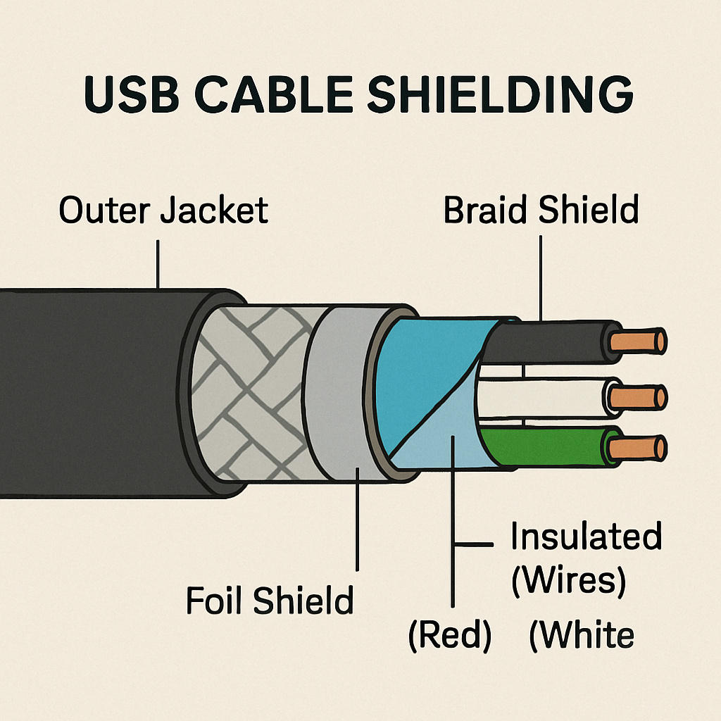 To prevent interference from other electronic devices, USB cables have shielding. Shielding is a layer of conductive material that surrounds the internal wires, protecting the data being transmitted from electromagnetic interference (EMI) and radio frequency interference (RFI). This ensures a stable and reliable data transfer.